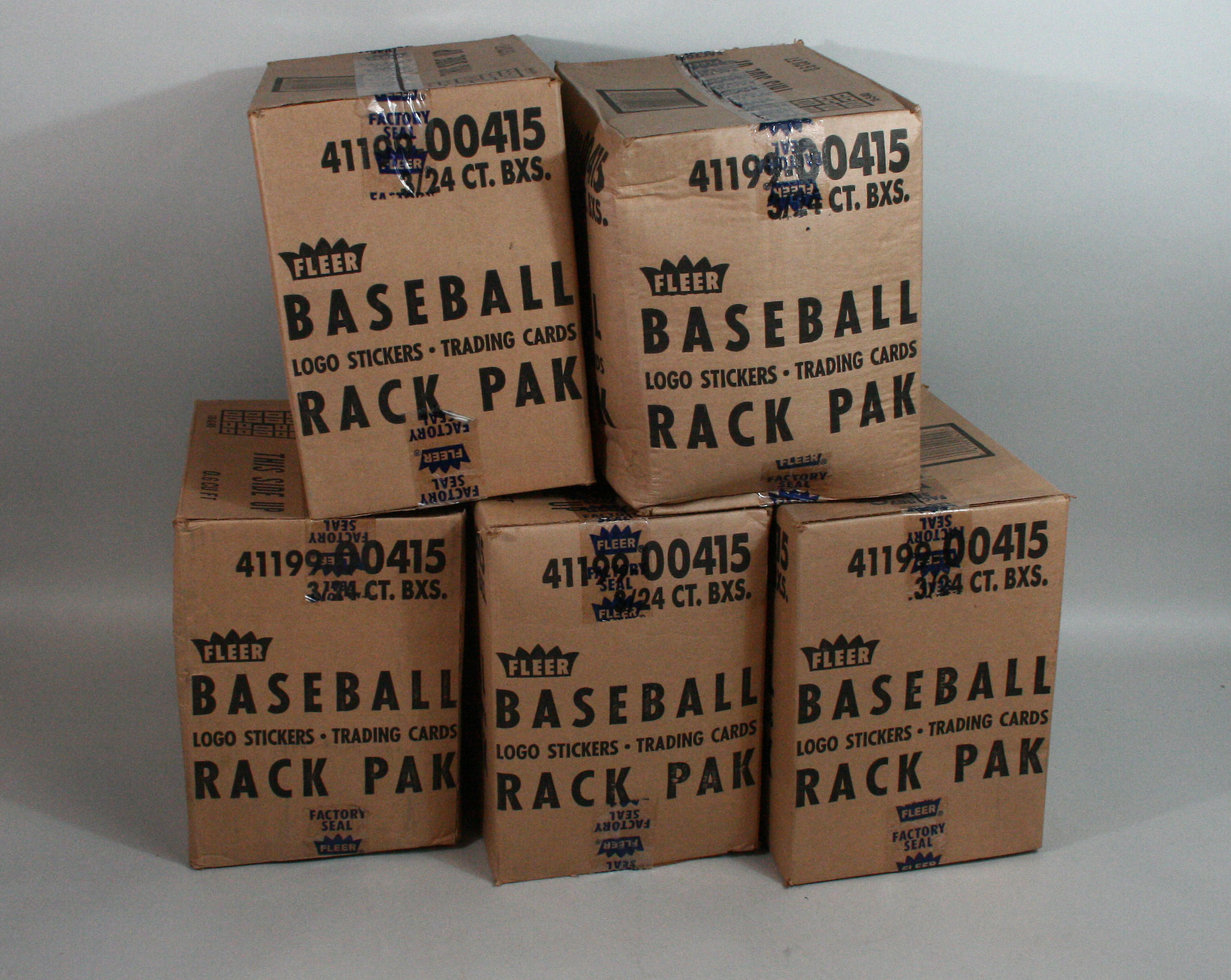 Description: Lot of (5) 1990 Fleer Baseball rack pack cases. Each case contains (3) 24-count rack pack boxes. All are factory sealed and exhibit light handling wear. Some cases have some denting/crumpling which usually does not effect the cards inside: EX/MT-NM