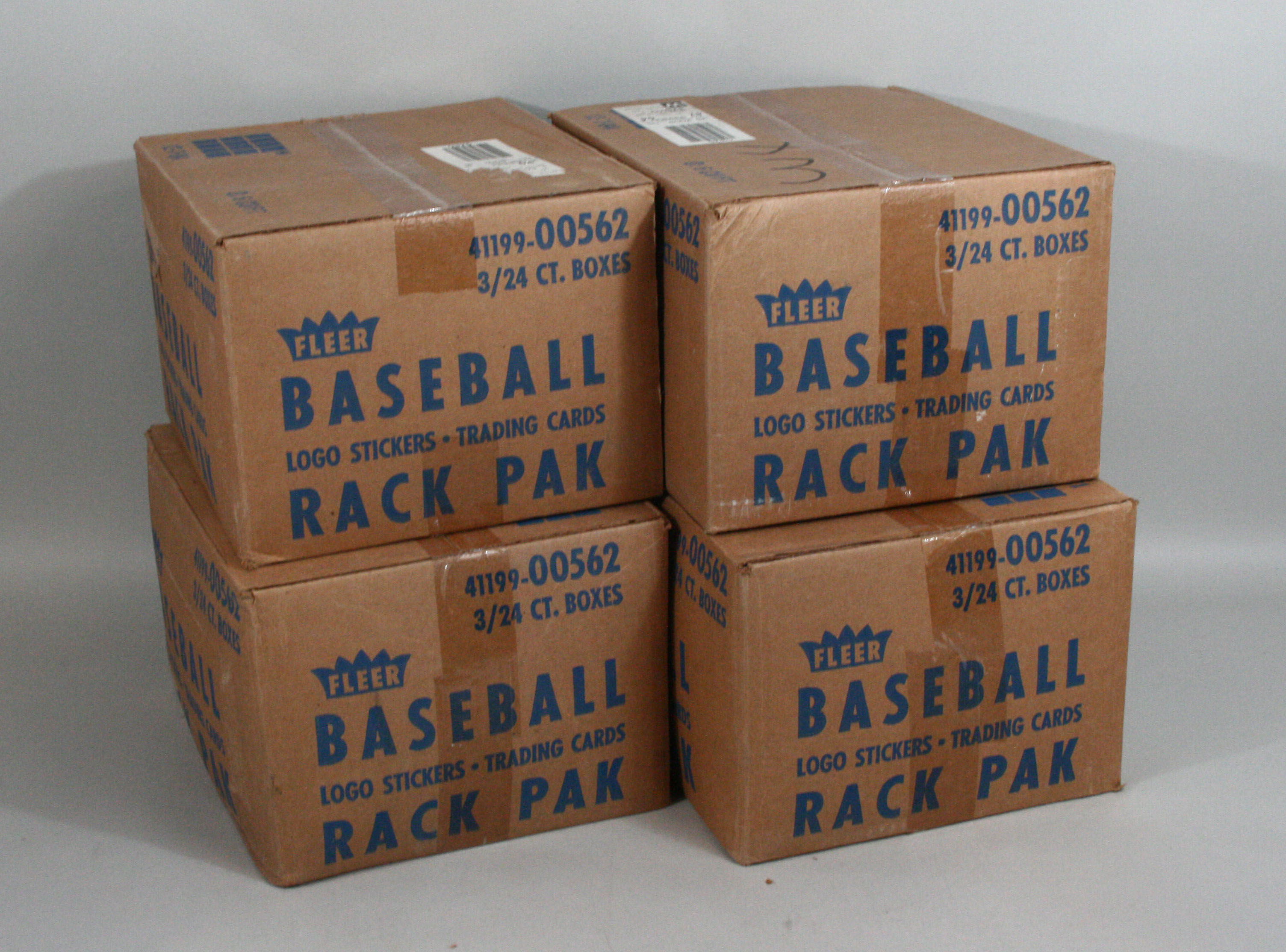 Description:Lot of (4) 1988 Fleer Baseball rack pack cases. Each case contains (3) 24-count rack pack boxes. All are factory sealed and exhibit light handling wear: EX/MT-NM