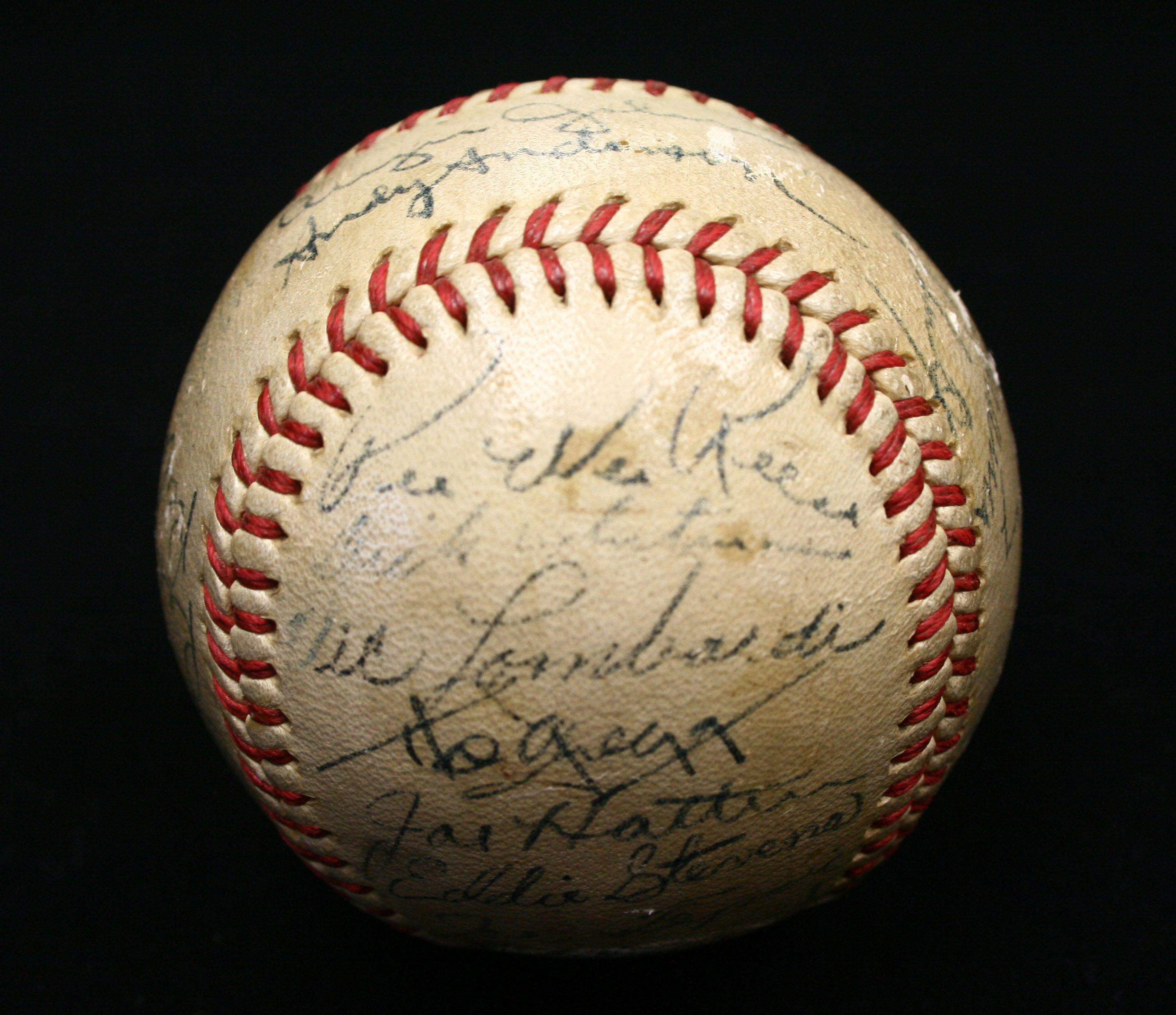 Description:UPDATED 1946 Brooklyn Dodgers team-signed baseball. Toned and clear-coated F.Frick NL ball signed by (24) incl. Leo Durocher, Joe Medwick, Rex Barney, Carl Furillo. Bruce Edwards, Pete Reiser, Cookie Lavagetto, Vic Lombardi, Ed Stevens, Joe Hatten, and others. Please Note: CHUCH DRESSEN, DIXIE WALKER AND PEE WEE REESE are Club House SignedSignatures rate 7 out of 10 on average and range 6-9 out of 10: EX