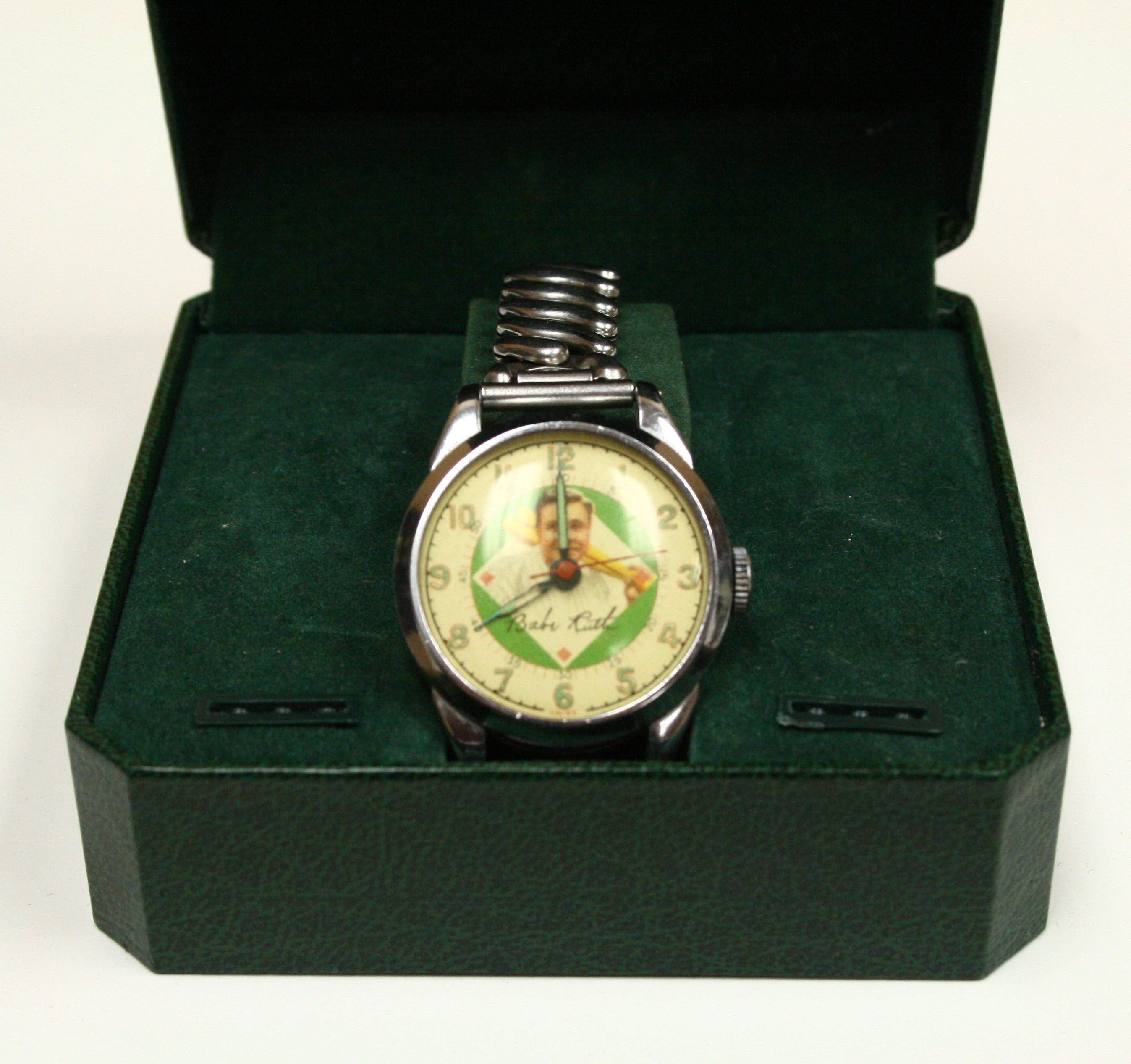 Description:1949 Babe Ruth wrist watch. Made by the Exacta Time Corporation. Depicts Ruth at the center with his facsimile signature beneath his portrait. Appears to be in working condition. Exhibits light surface wear overall. One of the links on the metal band is separated at one of the joints: VG/EX-EX