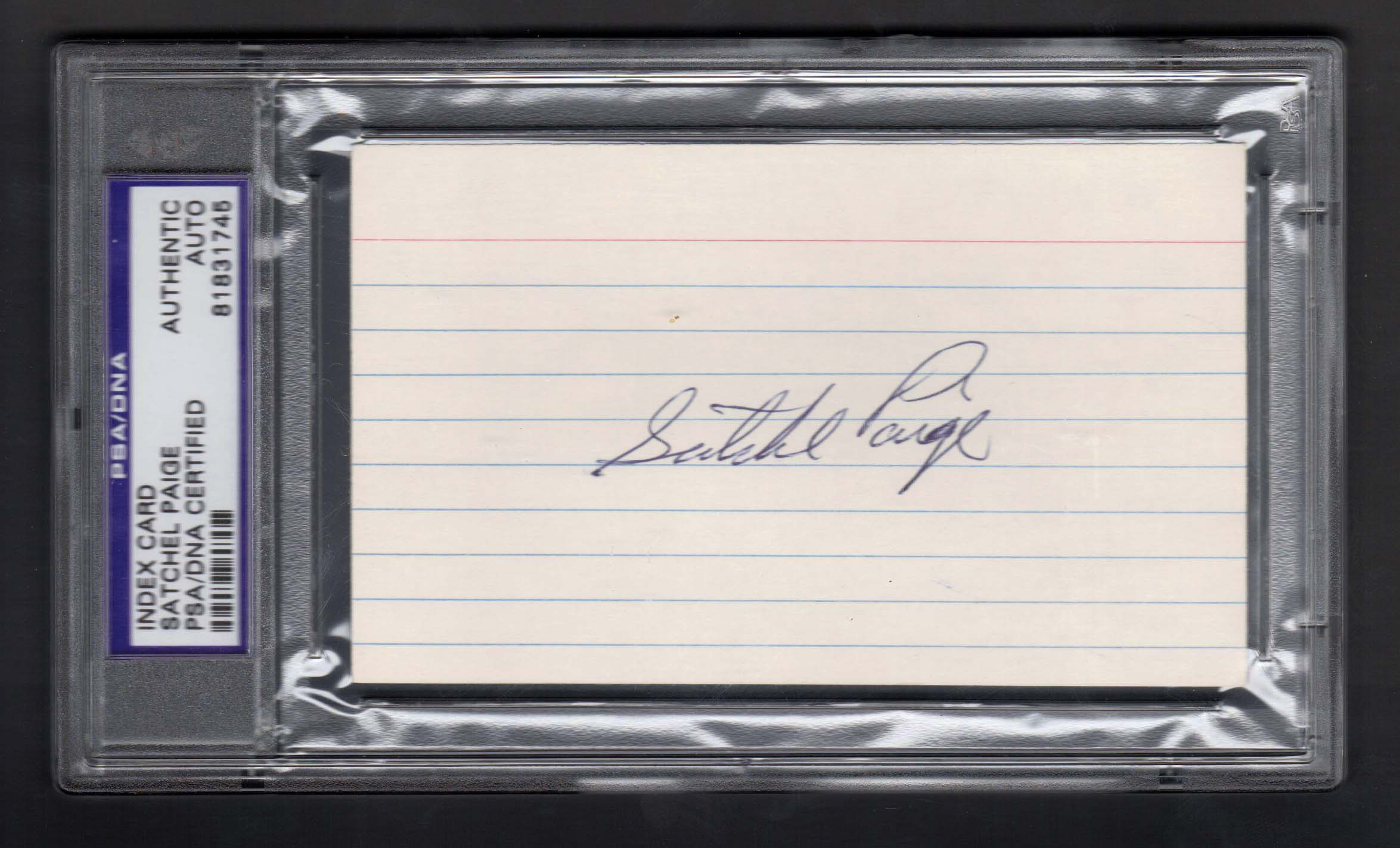 Satchell Paige signed index card. Paige signed the card in blue ink. Signature rates 9 out of 10. PSA/DNA authenticated and encapsulated: EX/MT