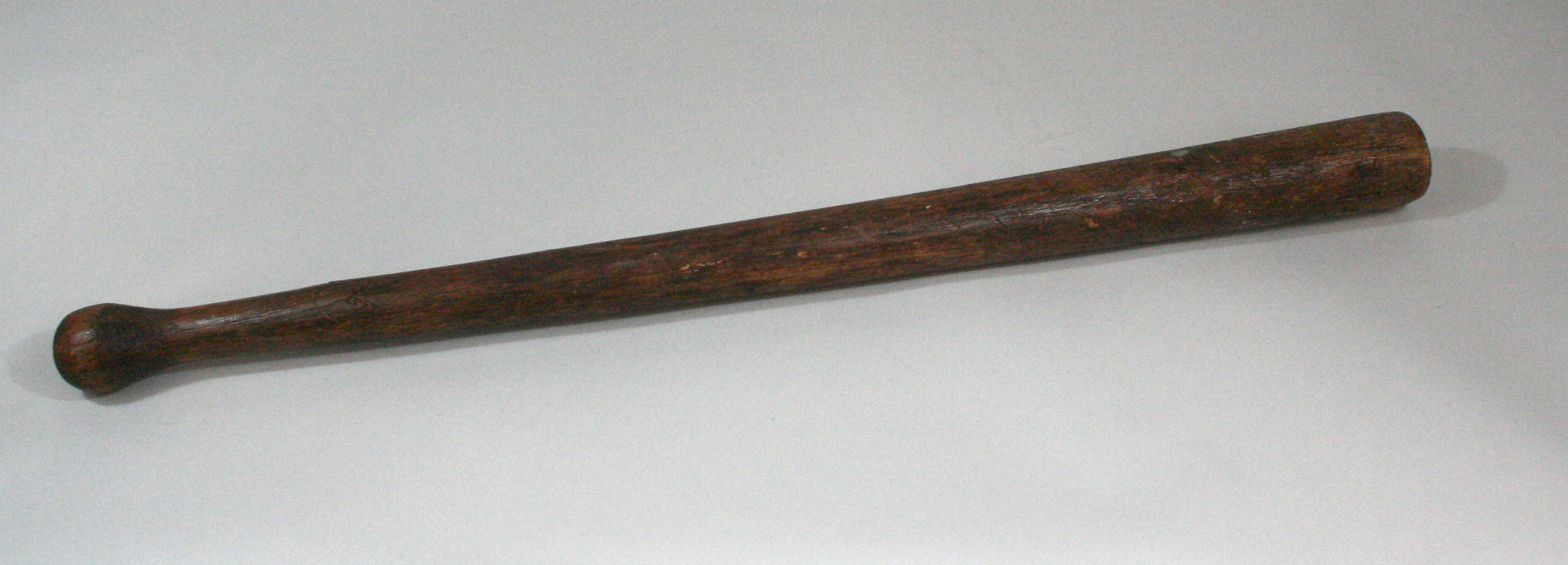 Description:Early handmade baseball bat c. 1870s. Measures 30" in length and has a bulbous knob. Exhibits moderate usage wear including surface nicks and minor denting. There is a crack in the handle which appears to have been reinforced at one time: VG/EX