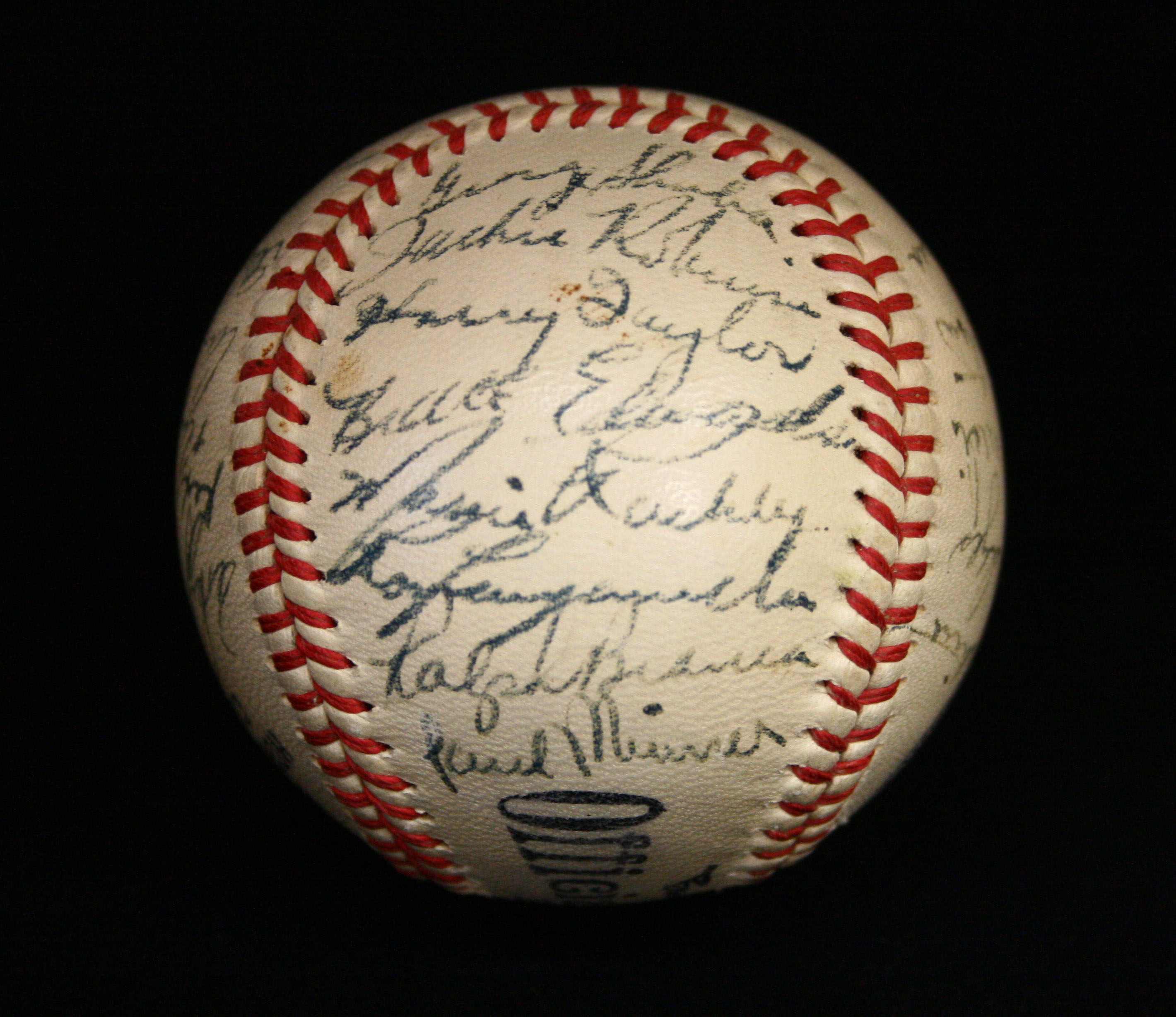 Description:1948 Brooklyn Dodgers team-signed baseball. Rawlings Branch Rickey "Official League" ball signed by (28) including Roy Campanella, Pee Wee Reese, Duke Snider, Preacher Roe, Carl Furillo, Gil Hodges, Arky Vaughan, Burt Shotton, Rex Barney, Gene Hermanski, Erv Palica, Hugh Casey, and others. There are (4) clubhouse signatures on the ball including Jackie Robinson, Ralph Branca, George Shuba, and Paul Minner. Signatures rate 8-9 out of 10: EX/MT