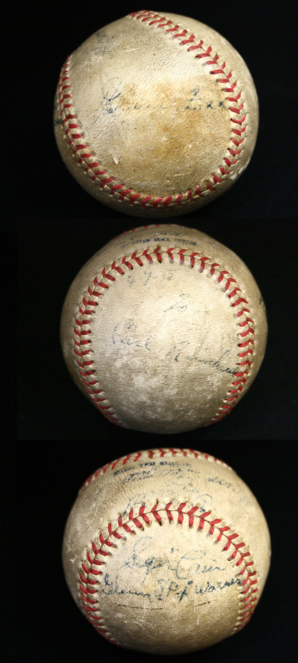 Description:Jimmie Foxx signed baseball. Toned and well worn "Official Major League Ball" signed by Jimmie Foxx on the left panel. Foxx's signature rates 3/4 out of 10. The right panel is signed by Bucky Walters (4/5 out of 10); top panel is signed by Sugar Cain and one other (5 out of 10), and the bottom panel has one unidentified signature. The Foxx signature can be displayed by itself: VG