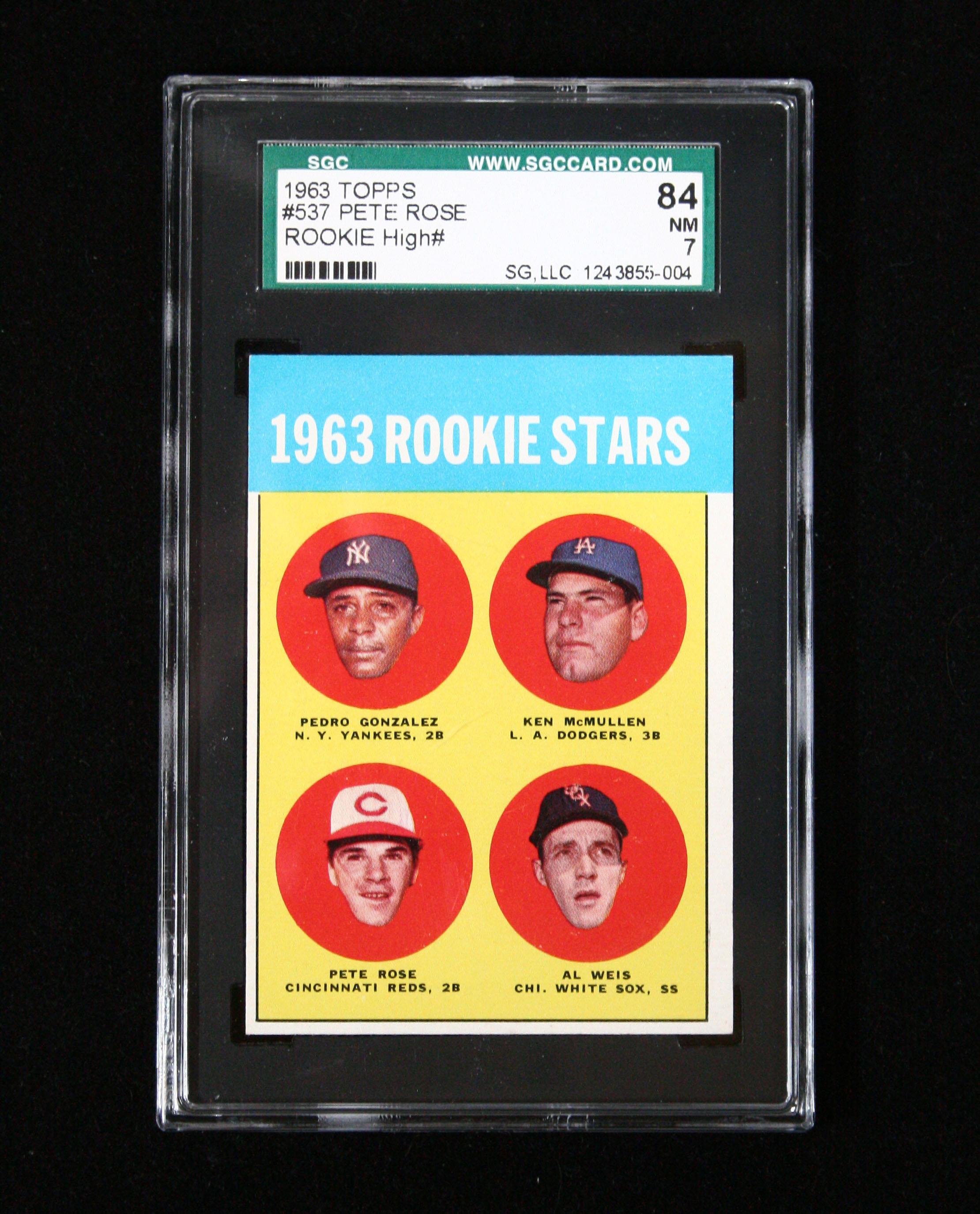 1963 Topps #537 Pete Rose rookie card. Exhibits strong color and registration with only very minimal corner wear. Graded SGC 84: NM