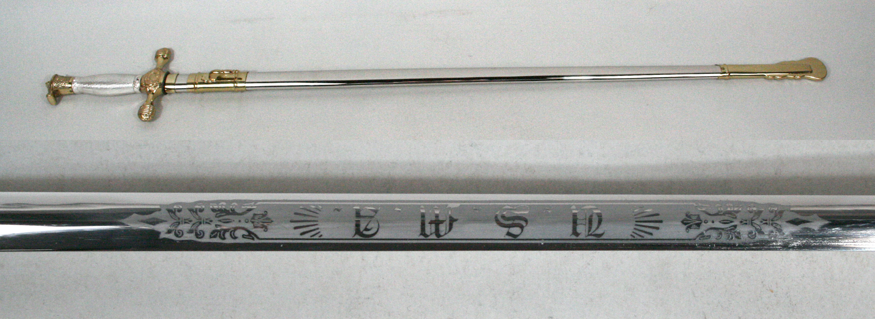 Description:United States Military Academy sword c. 1980. An unused class medium USMA sword marked "WKC Solingen Germany Stainless" on the base of the blade. Overall sword measures 36.5" in length. The blade measures 30" in length. Handle is ornately detailed and "USMA" is etched into the blade: EX/MT-NM
