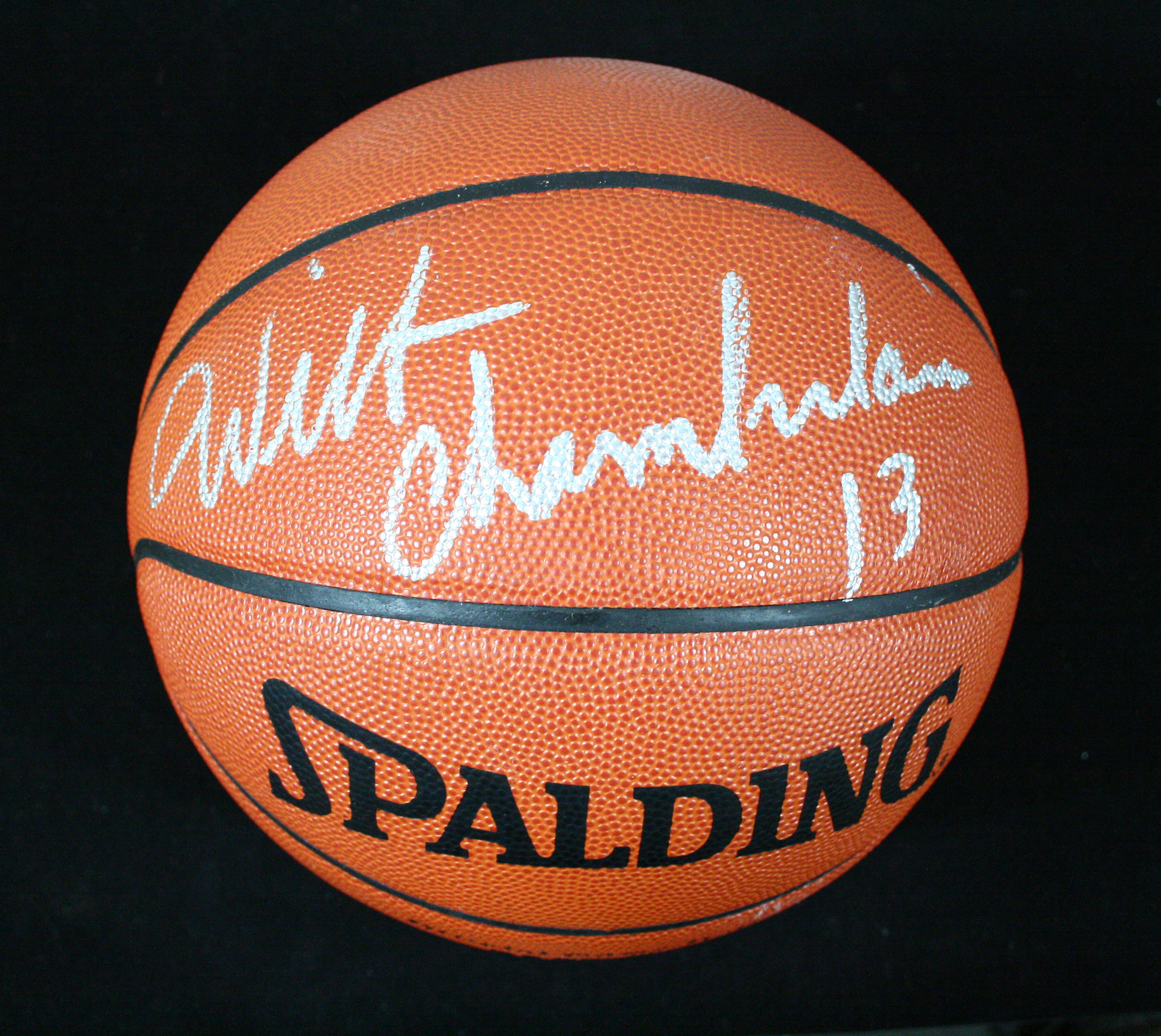 Description:Wilt Chamberlain single-signed basketball. Spalding Official NBA Game Ball (D.Stern) signed in silver paint pen on a side panel with an added "13" jersey number inscription. Signature rates 9 to 10 out of 10: EX/MT-NM