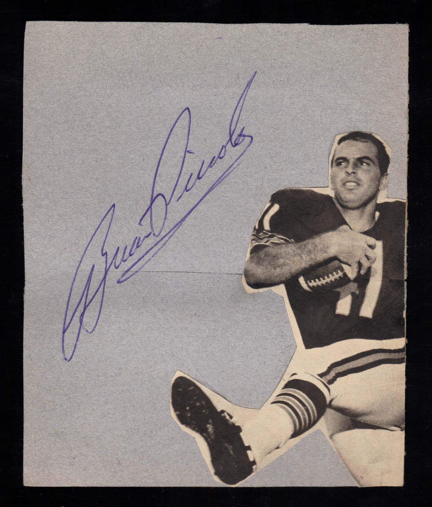 Description:Very rare Brian Piccolo cut signature. Nice large blue ink signature on a 4 1/2"x5 3/8" piece of gray construction paper. Signature rates 9/10 out of 10. There is a very thin cut/tear in the paper which is reinforced by clear tape on the back: EX-EX/MT