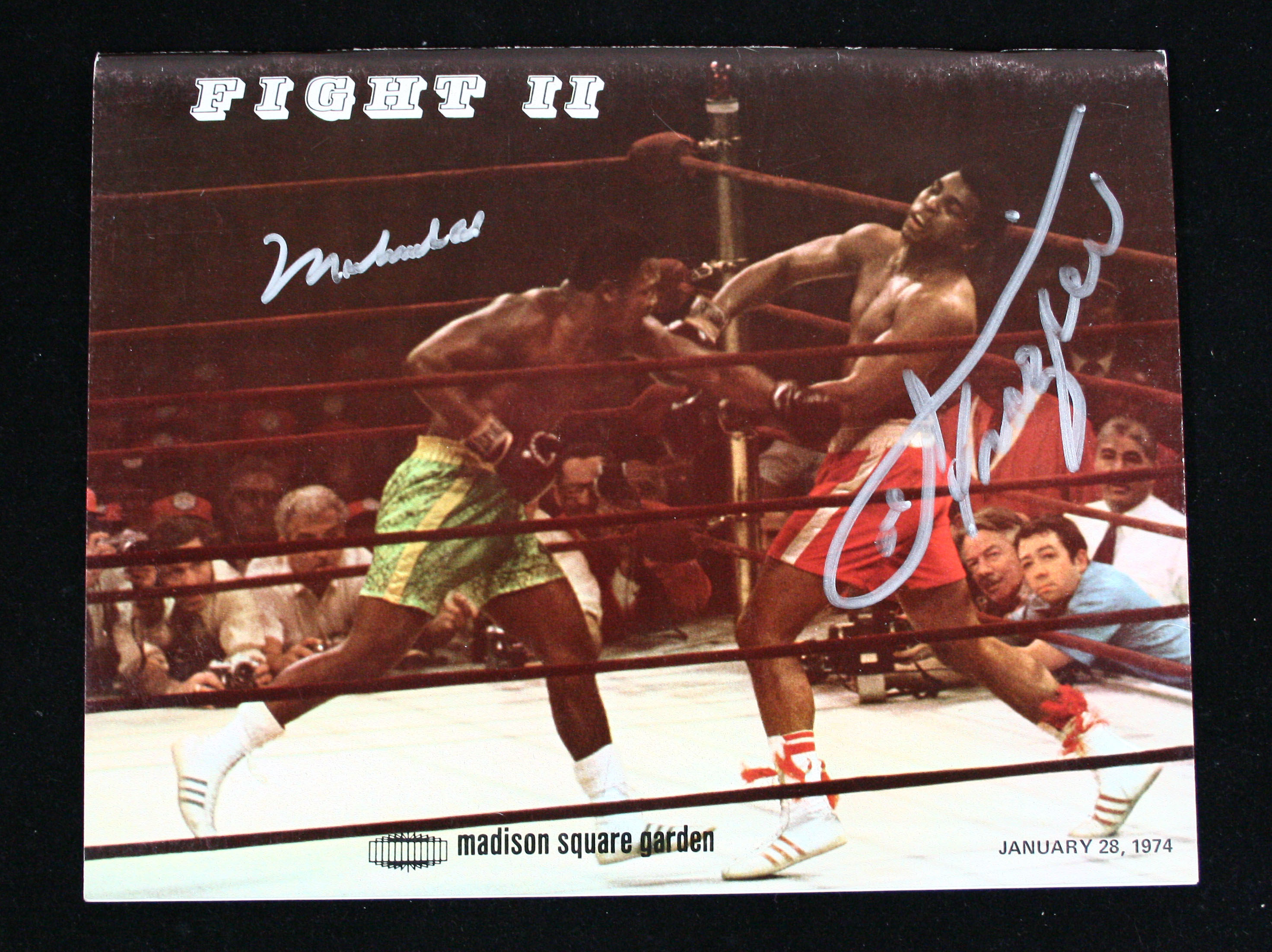 Description:Muhammad Ali and Joe Frazier signed January 28, 1974 "Fight 2" program. Original Madison Square Garden fight program depicting the pair in their earlier 1971 bout. Signed on the cover in silver paint pen rating 9 to 10 out of 10: EX/MT