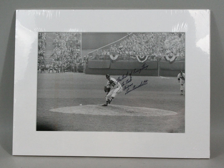 Description:Lou Burdette signed original 1957 World Series photo. 9"x13" b&w photo by Frank Stanfield which depicts Burdette pitching during the 1957 World Series. Burdette's period inscription rates 9 out of 10 and reads "The Best of Everything To Bob From Lou Burdette". Photo is matted to 8.5"12.5" (matting measures 12.5"x16.5": EX/MT