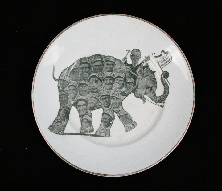 Description:1911 Philadelphia Athletics World Champions plate. Porcelain 10" diameter dinner plate with transfer scene decorated elephant in the center and bust images of the World Champion A's incl. Mack, Baker, Bender, and Collins. Marked "Florence Cook Pottery" on back. Very clean with only some wear to gilt edge decoration: EX/MT
