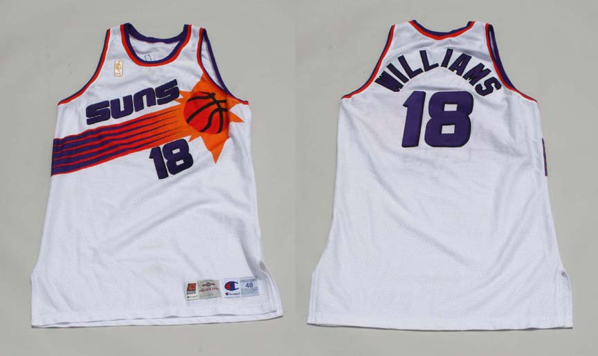 Description:1994-95 John "Hot Rod" Williams game-worn Phoenix Suns home jersey. Mesh jersey with "SUNS" across front, "WILLIAMS" across back, and #18 on front and back. Retains its original Champion size 48 and Suns exclusive tagging on front lower left. Jersey was originally issued to Richard Dumas and later recycled for use by Williams. Both the # and name were changed by the team. Exhibits light usage wear. Incl. LOA from MEARS (graded A5): EX