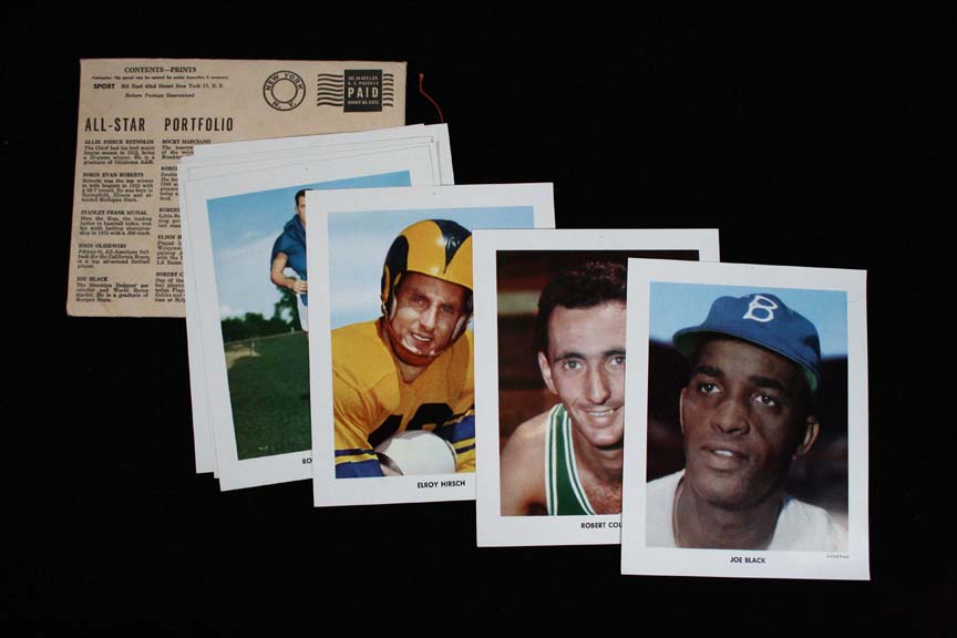 Description:Sport Magazine All-Star Portfolio premium set with Mailing Envelope, c. mid 1950s. Series of (10) 5.5"x7" color premiums incl. Robin Roberts, Bob Mathias, Rocky Marciano, Bob Cousy, Joe Black, Stan Musial, and others. All have pin-hole along upper edge and very minor cover wear. Incl. original mailing envelope exhibiting minor expected wear: Overall EX with EX-EX/MT appearance.
