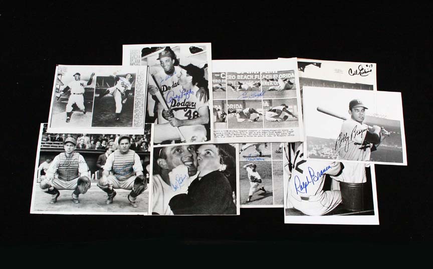 Description:Lot of (10) mostly Brooklyn Dodgers signed press photographs, c.1940s-50s. Notable signers incl. Enos Slaughter, Mickey Owen, Carl Erskine, Ralph Branca (1990s issue), Carl Erskine, Clem Labine, Preacher Roe, and others. Sigs. rate 7 to 9 (avg 8) out of 10. Minor wear throughout. Many high quality images: EX-EX/MT