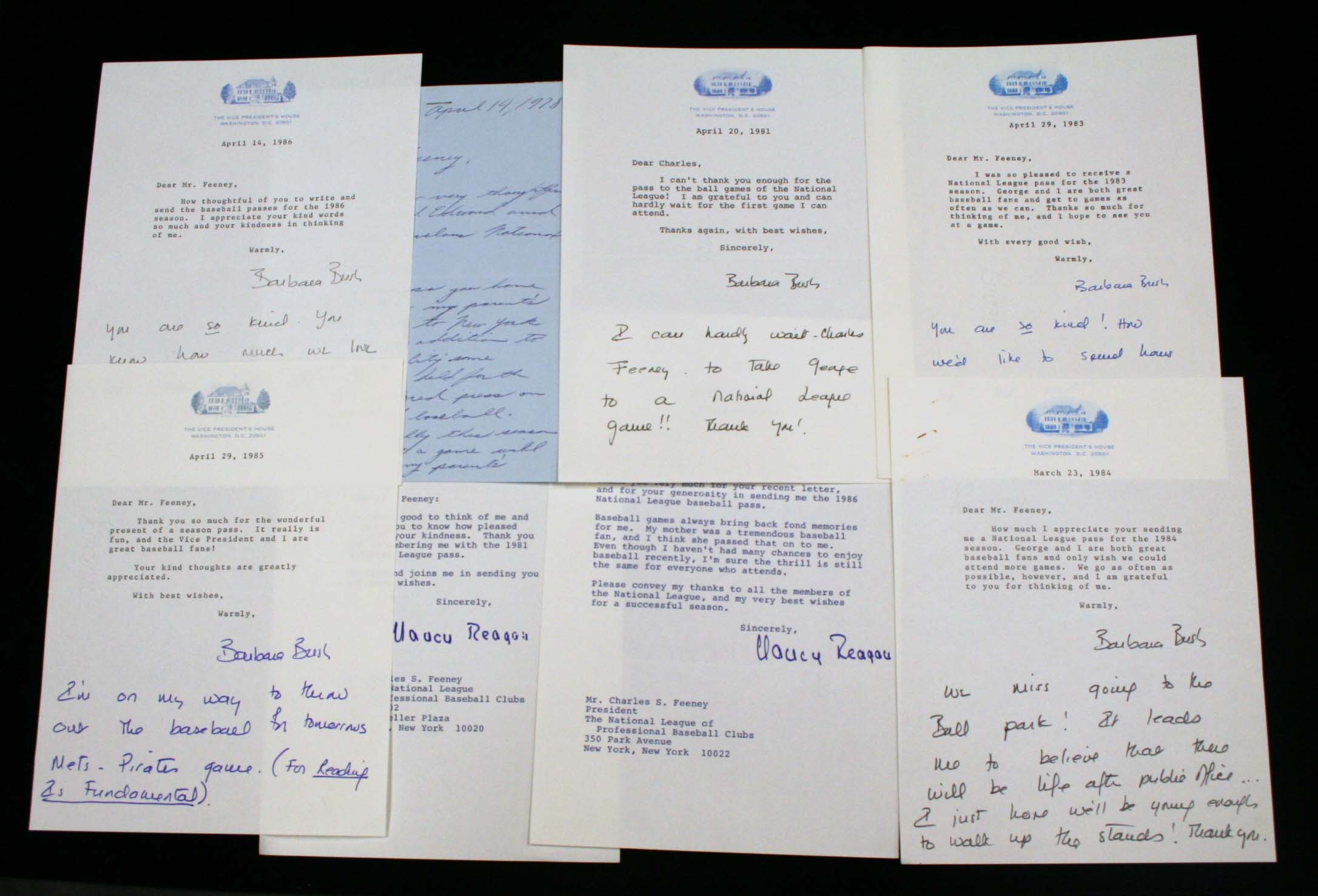 Description:Lot of (8) First Lady signed letters to Charles Feeney. Incl. a Pat Nixon signed hand-written letter w/ original mailing envelope; (2) Nancy Reagan signed typed letters on The White House stationary; and (5) Barbara Bush signed typed letters on The Vice President's House stationary. Bush added a hand-written note on each letter. The letters are all in response to receiving National League passes. Signatures rate 9-10 out of 10: EX-EX/MT