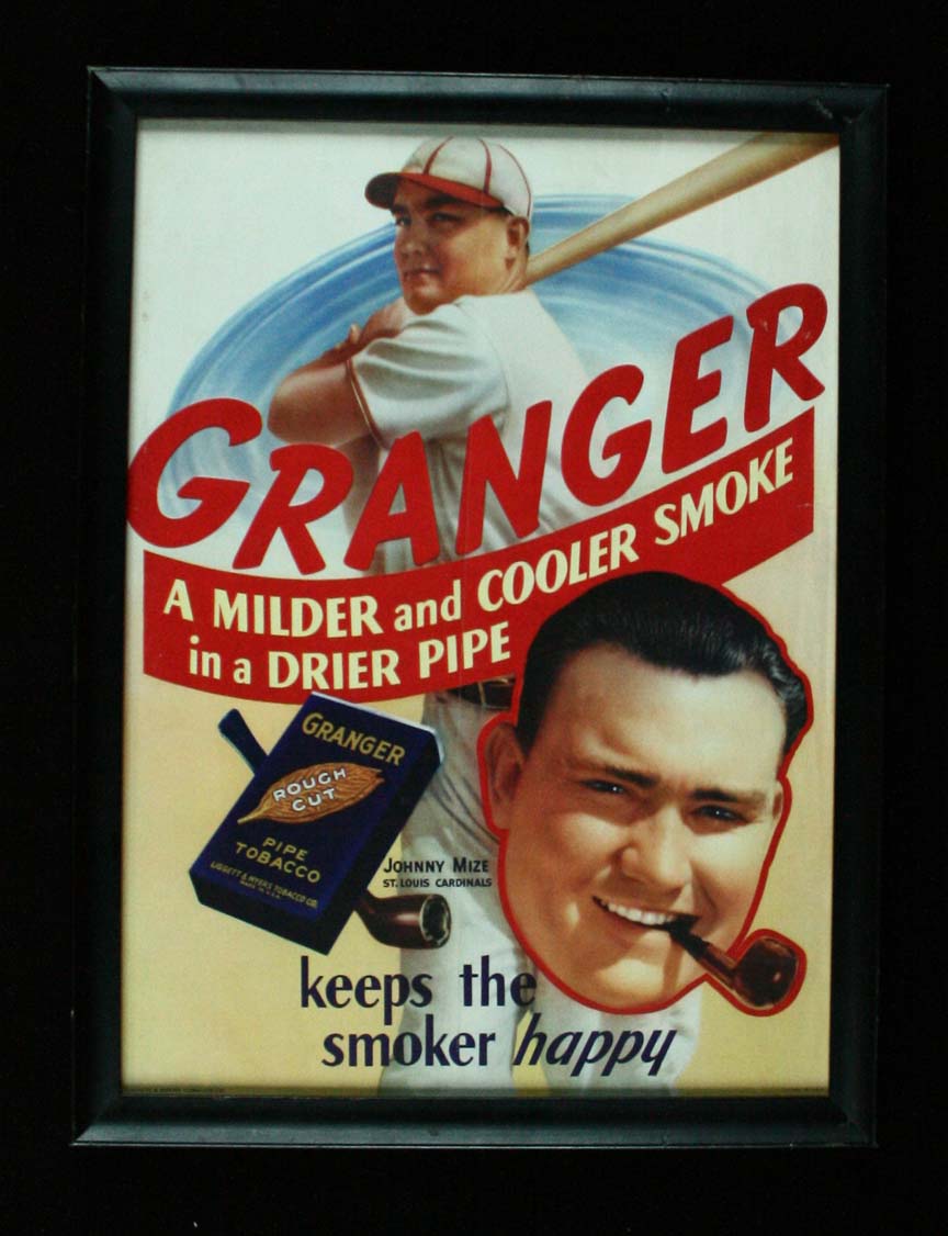 Description:Johnny Mize Granger tobacco advertising sign c.1930s-40s. Cardboard display piece measuring 15"x20" pictures Mize batting in a Cardinals uniform advertising Granger tobacco. Color remains very strong with a long vertical crease and some small creases mostly at the edges. Displayed in a vintage frame. Visible area: VG-EX