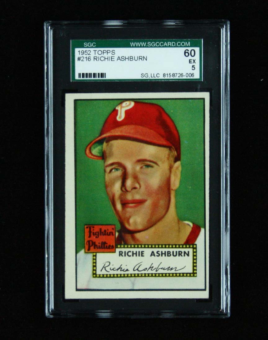 1952 Topps #216 Richie Ashburn. Exhibits mainly light corner wear. Clean front and back. Graded SGC 60: EX