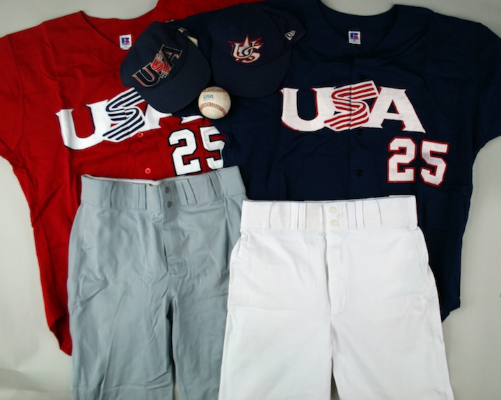 Description:Royce Ring "Team USA" 7-piece game-used ensemble (EX). Includes: Russell Athletic size XXL red #25 jersey; Russell Athletic size XXL blue #25 jersey; Russell Athletic size 38 grey pants with "25" written on the tag, Russell Athletic size 36 white pants with "25" written on the tag; (2) New Era caps with "25" and "RINGER 25" written inside; and a used Rawlings Official League USA baseball. Uniform pieces show light to moderate usage wear: EX overall.