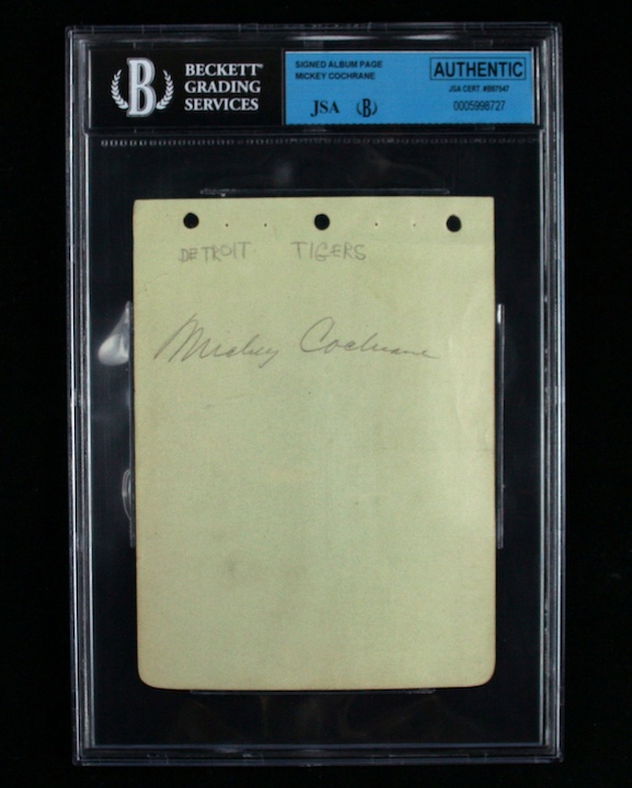 Description:Mickey Cochrane signed album page JSA (EX). 4.5"x6" album page signed by Cochrane in pencil. Signature rates 9 out of 10. Authenticated by JSA and encapsualted by BGS: EX
