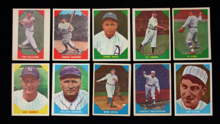 1960 Fleer Baseball complete (79)-card set (GD-EX). Key cards grade: #s 1 Lajoie (EX-EX/MT), 2 Mathewson (GD/VG), 3 Ruth (VG), 6 Johnson (VG), 28 Gehrig (EX), 42 Cobb (VG/EX-EX), 47 Young (VG-VG/EX wax stain on back), 53 Foxx (EX wax stain on back), 62 Wagner (VG/EX), and 72 Williams (EX). Remainder grade VG-VG/EX overall. Range GD-EX