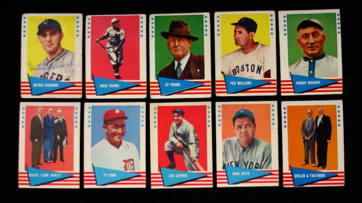 Description:1961 Fleer Baseball complete (154)-card set with (3) signed (GD-EX). Key cards grade: #s 1 Checklist (VG), 14 Cobb (VG/EX), 31 Gehrig (EX), 75 Ruth (GD), 89 Checklist (VG, marked), 150 Wagner (VG), 152 Williams (VG), 153 Young (GD), and 154 Young (GD). The three signed cards are #s 27 Fonseca (signed on back), 119 Kuhel, and 121 Leonard. Remainder grade VG overall. Range GD-EX