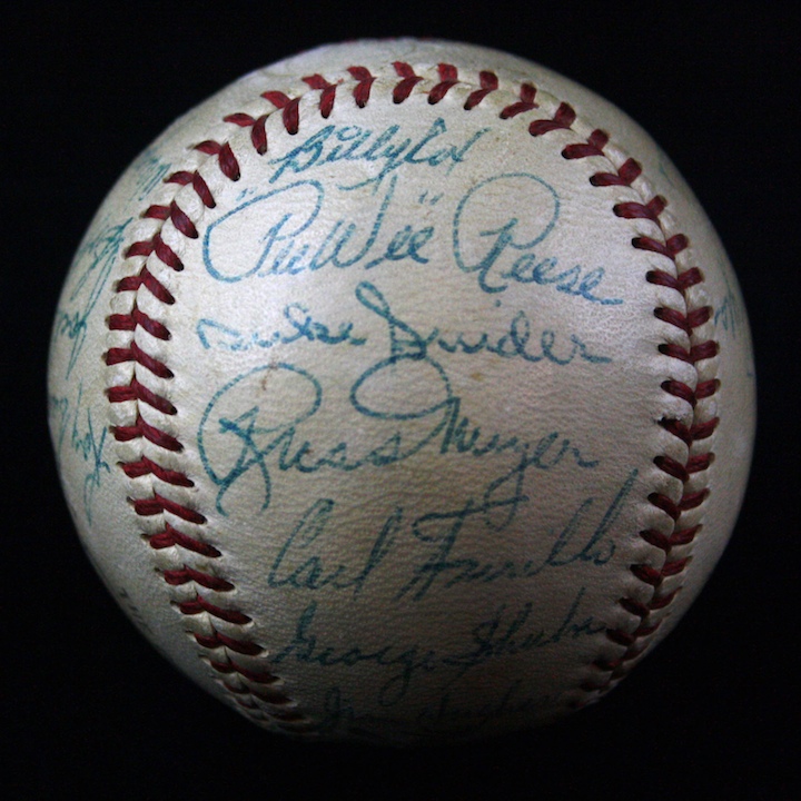 Description:1953 Brooklyn Dodgers team-signed baseball with Robinson (EX). Spalding W.Giles NL ball with (26) signatures including Jackie Robinson, Pee Wee Reese, Duke Snider, Gil Hodges, Carl Furillo, George Shuba, Preacher Roe, Chuck Dressen, Joe Black, and others. The Campanella signature is clubhouse. Signatures rate 6-8 out of 10 on average. Ball exhibits light toning and circle indentations on the sweet spot and stamping. Includes an auction LOA from JSA: EX
