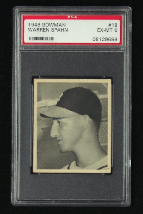 1948 Bowman #18 Warren Spahn rookie (PSA 6 EX-MT). Very nicely centered with light corner wear. Graded PSA 5: EX