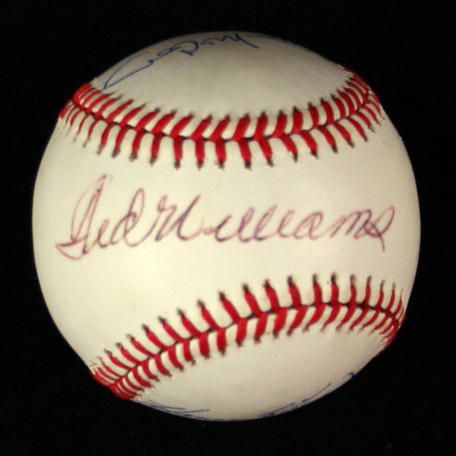 Description:Ted Williams, Willie McCovey, Mike Schmidt, Eddie Matthews, & Harmon Killebrew multi-signed baseball (EX-EX/MT). B.Brown AL ball signed by Williams on the sweet spot and by McCovey, Mathews, Killebrew, and Schmidt on the side panels. Ink signatures rate 7-8/9 out of 10. Ball is very lightly toned: EX-EX/MT