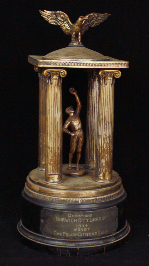 Description:Very ornate 1934 Norwich City League Baseball Champions trophy (VG/EX). Measures 17" tall with the round wooden base measuring 8 3/4" in diameter. On top of the base is a very detailed silver plated metal figural with four roman style pillars, baseball player figure within the middle of the pillars, and a Bald Eagle perched upon the top of the structure. The metal placard on the base reads "Champions - Norwich City League - 1934 Won By The Polish Citizens Club". Trophy displays very well and shows toning and some surface loss on the silver plated metal parts. The wooden base has two minor splits on one side (splits are where the wood was glued originally). Weighs approximately 11 1/2 pounds.: VG/EX