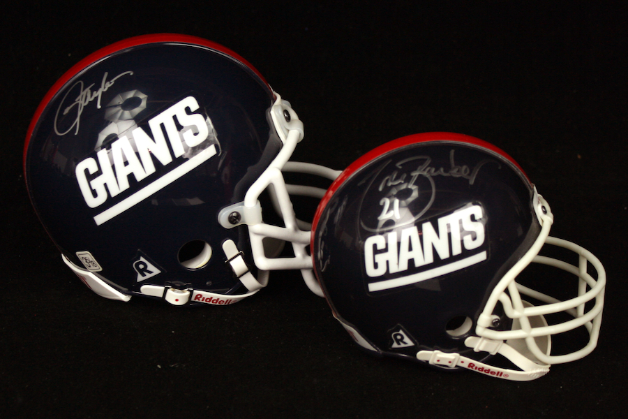 Description:Lawrence Taylor and Tiki Barber signed New York Giants mini helmets. (EX/MT-NM) Riddell 3 5/8 Giants mini helmet signed by Lawrence Taylor in silver marker rating 9 out of 10, comes with COA from Steiner with hologram affixed; Riddell 2 7/8 Giants mini helmet signed by Tiki Barber in silver marker w/ "21" inscription rating 8/9 out of 10: EX/MT-NM