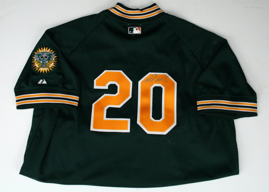 Description:Mark Mulder used and signed Oakland Athletics Batting Practice jersey (EX/MT). Polyester pull over jersey with "Athletics" across front and #20 on back. An Athletics elephant logo patch is on the left sleeve. Retains its original Majestic size 52 tagging in collar. Jersey exhibits light to moderate usage wear. Mulder signed the #0 on the back in silver sharpie. Signature rates 8 out of 10. Includes a COA from the Oakland Athletics stating that the jersey was used by Mulder: EX/MT