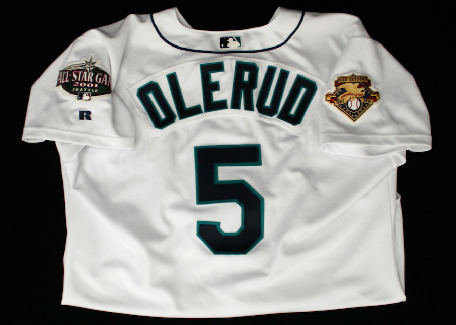 Description:2001 John Olerud signed professional model Seattle Mariners home jersey (EX/MT). Knit button down jersey with "MARINERS" across front, "OLERUD" across back, and #5 on back. A 1901-2001 American League 100 Seasons patch is on the right sleeve. A 2001 All Star Game patch is on the left sleeve. Retains its original Russell Athletic size 50, 2" Extra Length, Tapered Body, and 2001 year tagging on the front lower left. Jersey exhibits light to moderate usage and wash wear. Olerud signed the front of the jersey in blue sharpie. Signature rates 8 out of 10. Includes LOA from Grey Flannel: EX/MT