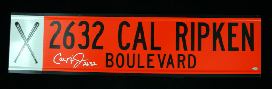 Description:Cal Ripken Jr. signed and inscribed "2632 Cal Ripken Boulevard" replica 9"x36" street sign (EX/MT). Large metal sign is painted orange with black lettering and crossed bats. Ripken signed the sign in silver sharpie and added "2632" inscription. Includes a COA from Steiner: EX/MT
