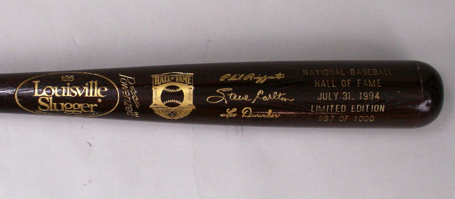 Description:1994 Baseball Hall of Fame Induction Louisville Slugger bat (NM) 34" brown bat which commemorates the 1994 HOF inductions of Phil Rizzuto, Steve Carlton, and Leo Durocher. Limited edition #ed 897 of 1000: NM