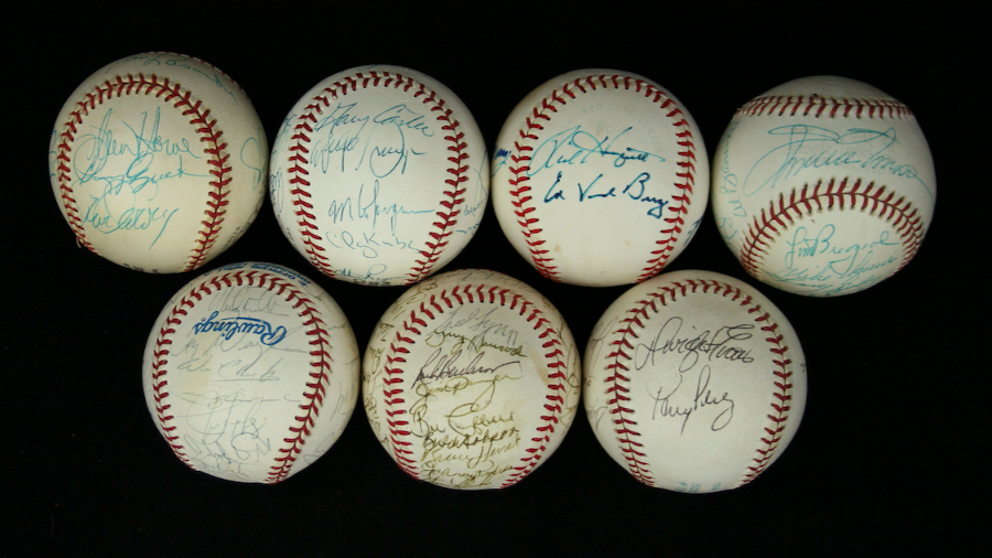Description:Lot of (21) misc. multi-signed baseballs c.1970s-80s (VG-NM). Includes (11) Spalding L.MacPhail AL balls: (1) with (34) Boston Red Sox signatures including Fisk, Eckersley, Rice, Lynn, and Perez; (1) with (13) signatures including Minoso and Doby; (1) with (11) Red Sox signatures including Pesky, Evans, and Perez; (3) with (4) misc. signatures; (1) with (8) misc. signatures; (1) with (6) misc. signatures; (1) with (5) misc. signatures; and (2) dual-signed; (1) Big League Autograph ball signed by (11) including Shantz, Simmons, Hamner, Lopata, and Short; (4) C.Feeney NL balls: (1) with (19) signatures including Snider; Doby, and Carter; (1) with (16) Dodgers signatures including Lasorda and Garvey; (1) with (8) Dodgers signatures including Lasorda and Garvey; aand (1) with (25) signatures including Carter and Perez; (1) J.Cronin AL ball signed by (19) including D.Williams and Pesky; (1) Official League Series Special ball signed by (9) including B.Kuhn; (1) G.Budig AL ball signed by (36) including W.Clark and J.Gonzalez; and a MacGregor Official International League ball signed by (22) misc. Most signatures rate 7-8 out of 10 with some lesser or better. There may be a few clubhouse signatures within. Some balls have light to moderate toning/wear: VG-NM