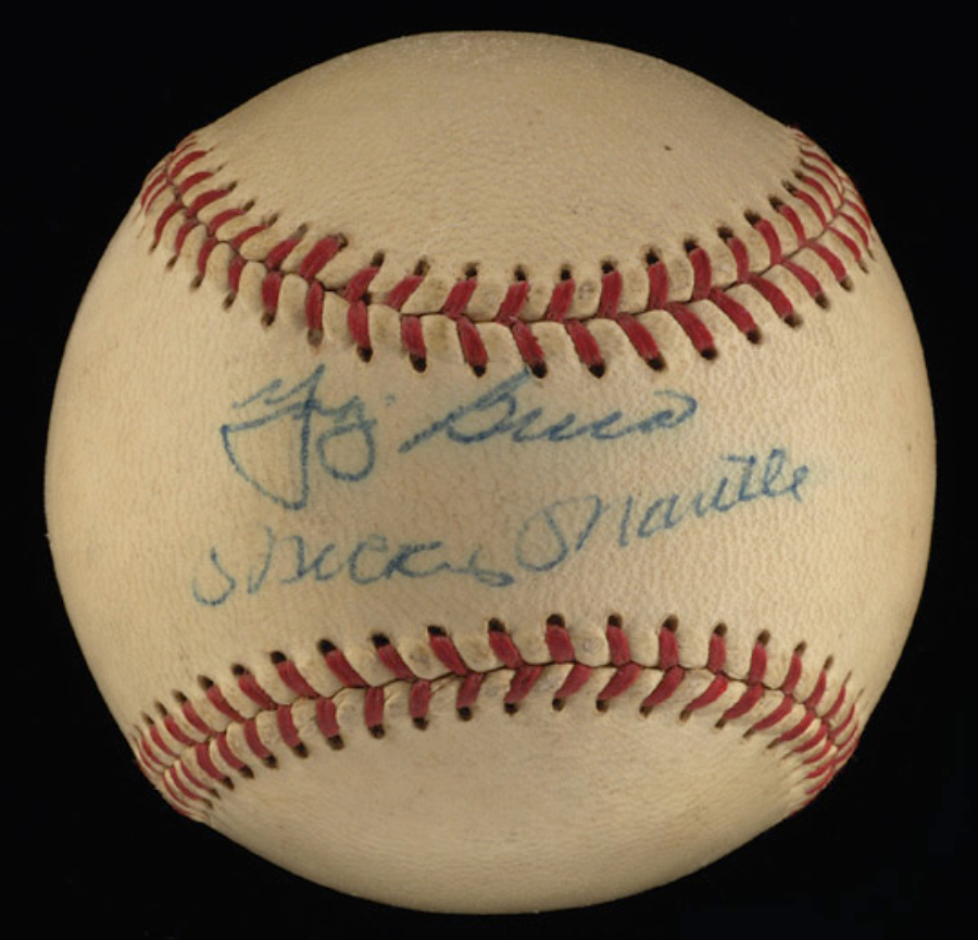 Description:Vintage Mickey Mantle and Yogi Berra autographed baseball c.1950s (EX-EX/MT). Off white Harridge AL ball is signed across the sweet spot in blue fountain pen by the two most notable Yankees players of the golden 1950s era. The Berra and Mantle signatures both rate 8/9 out of 10 displaying beautifully across the sweet spot. Highly uncommon vintage signed baseball is the first of its type that we have encountered. Includes its original ball box and an auction LOA from JSA: EX-EX/MT