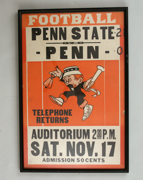 Description:Vintage Penn State vs. Penn Football broadside c.1920s (VG-VG/EX). Original 14"x21" orange, black, and white broadside advertising the Saturday, November 17th Penn State vs. Penn football game. The final score of the game (Penn 0, Penn State 21) is inscribed next to the team names. Broadside exhibits light creasing. Displays well overall. Housed in a 14.5"x22" frame: VG-VG/EX