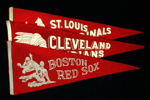 Description:Vintage Boston Red Sox, Cleveland Indians, and St. Louis Cardinals pennants, c.1940s-1950s. (EX-EX/MT) Incl. 27" red pennant featuring fielder and sliding baserunner at left, with "Boston Red Sox" in gray lettering across pennant (EX-EX/MT); 28" red pennant featuring Indian head logo at left, with "Cleveland Indians" in white block lettering across pennant (EX); and 27.5" red pennant featuring Cardinals logo at left, with "St.Louis Cardinals" in white block lettering across pennant (EX). Range: EX-EX/MT