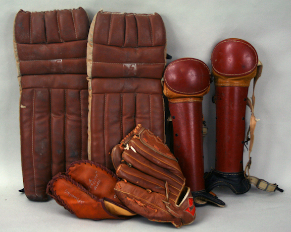 Description:Lot of misc. sports memorabilia and autographs c.1950s-80s (GD-EX/MT). Includes (15) misc. baseball gloves: notables include a Spalding two-finger 1343 trapper model glove (EX), Spalding two-finger 1327 trapper model glove (VG/EX), and MacGregor Pete Rose M3P model glove (VG/EX); (4) signed 8"x10" color hockey photos: Gump Worsley, Tony Esposito, Johnny Bower, and Dominik Hasek (all are signed in sharpie and rate 9-10 out of 10); (4) misc. pairs of baseball catcher shin pads; pair of hockey/lacrosse goalie pads; pair of hockey gloves, and 1960s Bob Cousy Pro 14 Basketball Shoes bag (EX). Range GD-EX/MT