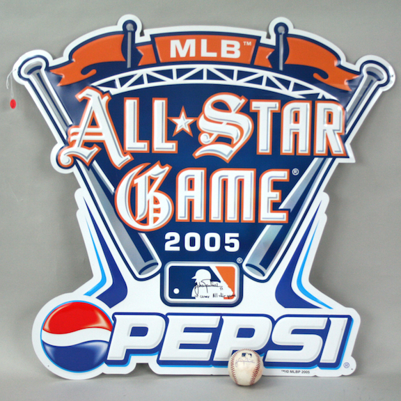 Description:Johan Santana signed game-used baseball and 2005 All-Star Game Pepsi tin sign (EX-NM). Includes a B.Selig MLB ball used in the Kansas City Royals vs. Minnesota Twins game on August 1, 2007 signed by Santana in blue ink on a side panel. A MLB Authenticated serial #ed hologram is affixed to the ball (#BB500871). Also includes a 29.5"x30" 2005 All-Star Game Pepsi tin sign signed by Santana in black sharpie. Santana added "1st Career All-Star Game" inscription. Signatures rate 9-10 out of 10: EX-NM