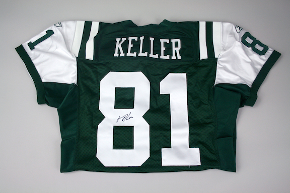 Description:Dustin Keller signed Reebok on-field style New York Jets jersey, c.2009 PSA/DNA. (EX/MT-NM) Reebok size 48 Jets jersey featuring "81" sewn on front, both shoulders, and back, along with "KELLER" nameplate sewn on back. Reebok NFL Equipment tagging is present on front tail, along with "48" flagged tagged. Keller signed the back in black marker. Signature rates 9 out of 10. Comes with COA from PSA/DNA (serial #ed sticker is affixed). Jersey exhibits no noticeable usage wear: EX/MT-NM