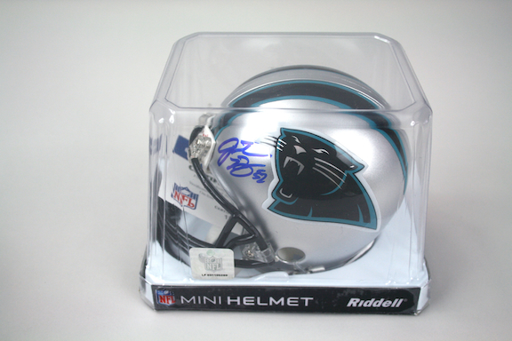 Description:Jon Beason signed and inscribed Carolina Panthers mini helmet PSA/DNA. (NM) Riddell Panthers mini helmet signed by Beason in blue marker with "52" inscription. Signature rates 9 out of 10. Comes with COA from PSA/DNA (serial #ed sticker is affixed): NM