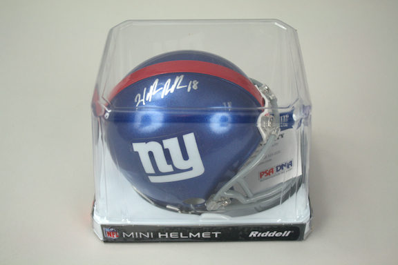 Description:Hakeem Nicks signed and inscribed New York Giants mini helmet PSA/DNA. (NM) Riddell Giants mini helmet signed by Nicks in silver marker with "18" inscription. Signature rates 9 out of 10. Comes with COA from PSA/DNA (serial #ed sticker is affixed): NM