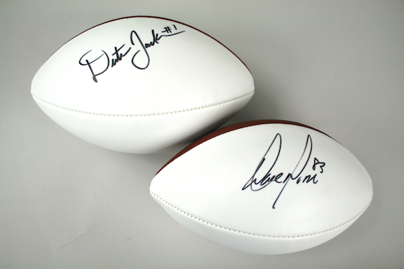 Description:Dexter Jackson and Dave Moore signed and inscribed R.Goodell white panel footballs. (NM) Incl. (2) Wilson R.Goodell The Duke white panel NFL footballs. (1) signed by Jackson in black marker with "#1" inscription. (1) signed by Moore in black marker with "83" inscription. Signatures rate 9 out of 10. Both come with COA from PSA/DNA (serial #ed sticker is affixed): NM