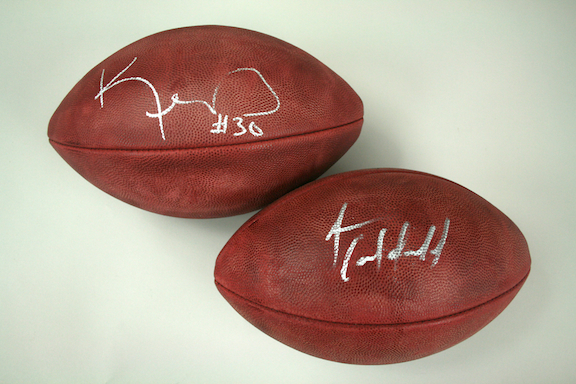Description:Andre Caldwell and Kenny Irons signed R.Goodell The Duke NFL footballs PSA/DNA. (NM) Incl. (2) Wilson R.Goodell The Duke NFL footballs. (1) signed by Caldwell in silver marker. (1) signed by Irons in silver marker with "#30" inscription. Signatures rates 8/9 to 9 out of 10. Both come with COA from PSA/DNA (serial #ed sticker is affixed): NM