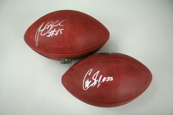 Description:Andre Gurode and Clifton Smith signed and inscribed R.Goodell The Duke NFL footballs PSA/DNA. (NM) Incl. (2) Wilson R.Goodell The Duke NFL footballs. (1) signed by Gurode in silver marker with "#65" inscription. (1) signed by Smith in silver marker with "#22" inscription. Signatures rates 8/9 to 9 out of 10. Both come with COA from PSA/DNA (serial #ed sticker is affixed): NM