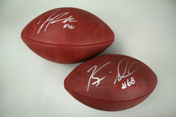 Description:Kris Dielman and Jay Ratliff signed and inscribed R.Goodell The Duke NFL footballs PSA/DNA. (NM) Incl. (2) Wilson R.Goodell The Duke NFL footballs. (1) signed by Dielman in silver marker with "#68" inscription. (1) signed by Ratliff in silver marker with "#90" inscription. Signatures rates 8/9 to 9 out of 10. Both come with COA from PSA/DNA (serial #ed sticker is affixed): NM