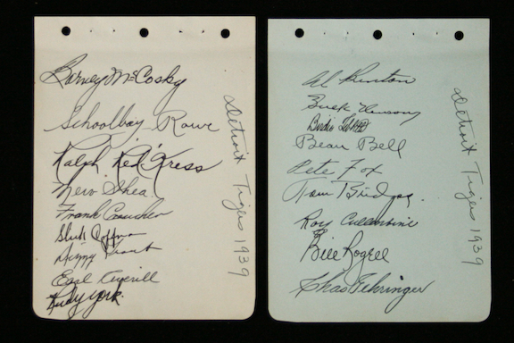 Description:1939 Detroit Tigers team-signed album sheets (EX/MT). Includes (2) 4.5"x6" autograph album sheets. One is signed by (9) including Charlie Gehringer, Al Benton, Buck Newsom, Birdie Tebbetts, Beau Bell, Pete Fox, Tom Bridges, Roy Cullenbine, and Bill Rogell. And one is signed by (9) including Barney McCosky, Schoolboy Rowe, Ralph "Red" Kress, Merv Shea, Frank Croucher, Slick Coffman, Dizzy Trout, Earl Averill, and Rudy York. All are signed in ink and rate 9-10 out of 10: EX/MT