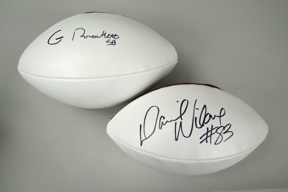 Description:Gary Brackett and Daniel Wilcox signed and inscribed R.Goodell white panel footballs. (NM) Incl. (2) Wilson R.Goodell The Duke white panel NFL footballs. (1) signed by Brackett in black marker with "58" inscription. (1) signed by Wilcox in black marker with "#83" inscription. Signatures rate 9 out of 10. Both come with COA from PSA/DNA (serial #ed sticker is affixed): NM