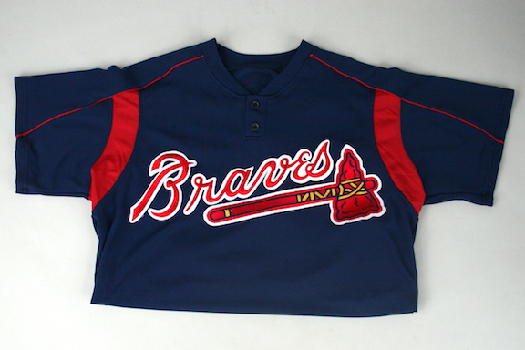 Description:Tim Hudson professional model Atlanta Braves pre-game batting practice jersey, c.2006. (EX) Majestic size 46, 2-button neck jersey with "BRAVES" and tomahawk sewn across front. Reverse features sewn number "15", along with "HUDSON" nameplate. Interior wash tag features pro-code 0065. Exhibits light usage wear: EX